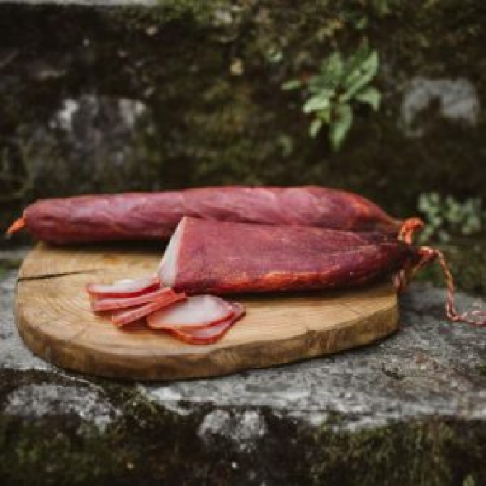 O noso Lombo Embuchado elabórase artesanalmente co lombo enteiro. Adóbase só con ingredientes naturais: sal, pementón e allo, masaxeando as pezas a man. Embútese e átase a man en tripa natural. Colga nos secaderos naturais, onde recibe un lixeiro afumado con leña de carballo. Cúrase lentamente, garantindo unha textura tenra e un gusto cheo de matices. É un produto 100% natural, sen glute nin lactosa.